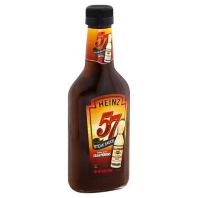 Heinz 57 Steak Sauce - 10oz : Target One 10 oz bottle of Heinz 57 Sauce. Heinz 57 Sauce uses a secret blend of spices to make it a favorite for over 100 years. Zesty multi use sauce uses delicious ingredients. Thick ready-to-use sauce is versatile enough for grilling, marinating and dipping. Made with tomato puree, vinegar and has a secret blend of spices with 20 calories per serving. Heinz 57 Sauce, 10 oz Bottle - Walmart.com Tomato puree, vinegar and spices create a zesty kick in this multi purpose sauce that contains 20 calories per serving and zero grams of fat per serving. It's the go-to steak dinner sauce, but Heinz 57 is also perfect as a sauce for pork or chicken, for meat marinating or as a dipping sauce.