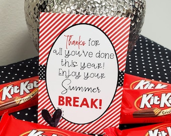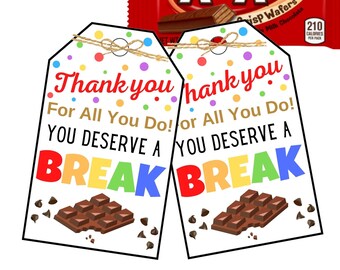 You deserve a break printable | Etsy You deserve a really big break Gift Tag, School Pto Pta Staff Employee Volunteer Teacher Appreciation, Candy Chocolate DIY Editable Template MabbRoseDesigns (1,188) $6.97 $7.75 (10% off) PRINTABLE Teacher Gift Tags, Teacher Gifts, Teacher Appreciation Tags, End of School Gift, You Deserve a Break Tags, Candy Gift Tags, Kit Ka NutmegsMarket (57) Kit Kat Apperciation Teaching Resources | Teachers Pay Teachers This is a PDF file that reads "You deserve a break Happy Teacher Appreciation Week"There are 12 images on a page.You can print these out, cut, place on a Kit Kat bar, and distribute.As a teacher myself, I can say without a doubt that this would be a wonderful Teacher Appreciation gift from an administrator. Subjects: