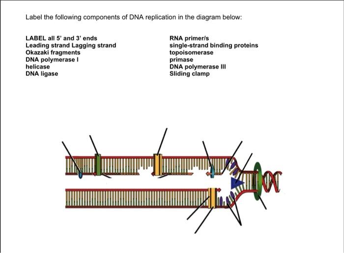 Solved Label the following components of DNA replication in Question: Label the following components of DNA replication in the diagram below: All 5' and 3' ends b) helicase f) DNA polymerase III Leading strand c) DNA ...