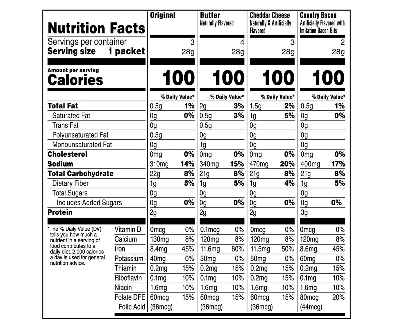 Quaker Instant Grits, Original: Calories, Nutrition ... - Fooducate Nutrition Serving Size: 1 packet (28g) Amount per Serving My Daily Value Calories 100 Kcal 6% Total Fat 0.5 g 1% Saturated Fat 0 g 0% Trans Fat 0 g 0% Cholesterol 0 mg 0% Sodium 310 mg 13% Potassium 40 mg 1% Total Carbohydrate 22 g 9% Dietary Fiber 1 g 4% Sugars 0 g 0% Added Sugars 0 g 0% Protein 2 g 4% Calcium 130 mg 13% Iron 8.4 mg 47%