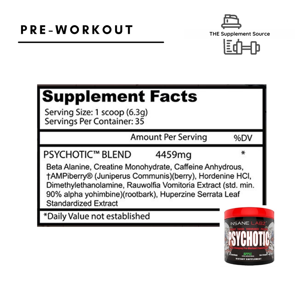 Psychotic Pre Workout Review | It's A Love/Hate Relationship Psychotic Pre Workout Review. Insane Labz Psychotic is a supplement that will get you psyched up to work out. It contains 400 milligrams of caffeine, loads of DMAE, creatine monohydrate, beta-alanine, and huperzine A. This product tastes great and will give you the energy needed for your workout. The only thing you need to be aware of is that ...