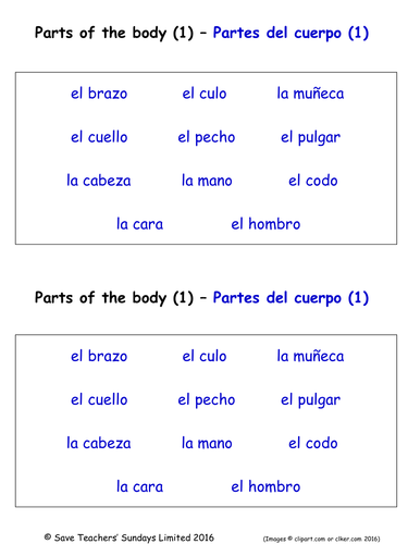 Body Parts in Spanish Activities Memory Game. Using the body parts in Spanish cards, children can play the traditional memory game. Place the cards down and taking turns, they have to turn up two cards at a time. If both cards match (are the same), they take it. If not, they have to turn them back down and try to remember where each card is placed.