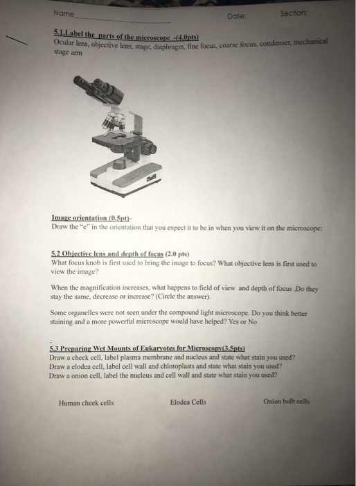 Label all indicated parts of the microscope. Activity 3.1.docx - Denise Learned Bio201 The Microscope... Denise Learned Bio201 The Microscope Care and Structure of the Compound Microscope 1. Label all indicated parts of the microscope. 2. Explain the proper technique for transporting the microscope. Answer: HOLD IT IN AN UPRIGHT POSITION WITH ONE HAND ON ITS ARM AND THE OTHER SUPPORTING ITS BASE A Study of the Microscope and its Functions With a Labeled Diagram ... These labeled microscope diagrams and the functions of its various parts, attempt to simplify the microscope for you. However, as the saying goes, 'practice makes perfect', here is a blank compound microscope diagram and blank electron microscope diagram to label. Download the diagrams and practice labeling the different parts of these ... Parts of a Microscope - Lab - Perkins School for the Blind Braille or large print handout including microscope parts and their functions. 1. Make braille or large print labels for the microscope. These should be letters, a through j. 2. Label the parts of the microscope with either large print or braille letters (as per the picture). 3. Label parts on microscope Flashcards | Quizlet Created by ashleibryson Terms in this set (14) Eyepiece Body Tube on microscope High power objective Low power objective Stage Opening Diaphragm Lever Light on microscope Coarse adjustment Fine adjustment Nosepiece Arm on a microscope Stage Clip Stage on microscope Base Sets found in the same folder Cell Organelles 28 terms MKL67