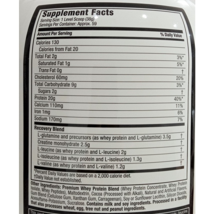 Six Star 100% Whey Protein Powder Triple Chocolate Vitamin D · 125 ; Calcium: 180mg 14 ; Iron: 1.3mg 7 ; Potassium: 270mg 6 ; Ingredients.