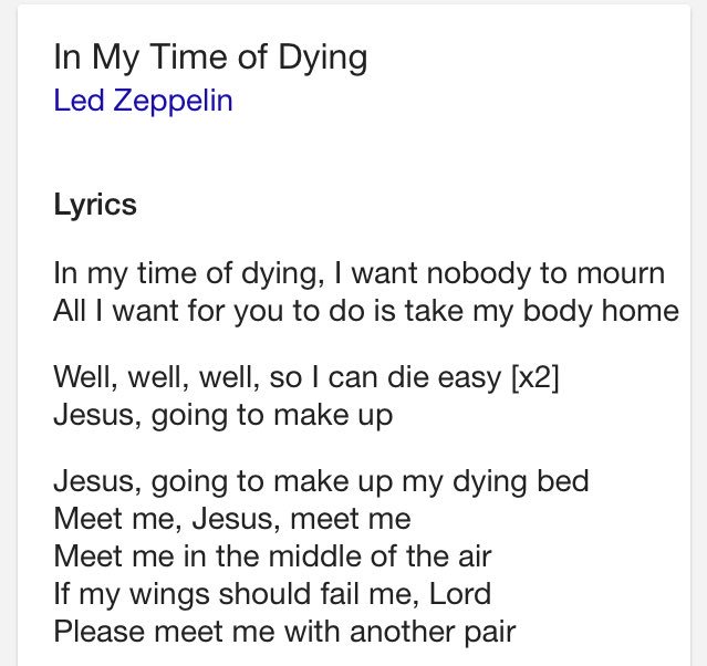In My Time Of Dying by Led Zeppelin - Songfacts In my time of dying, ain't gonna cry, ain't gonna mourn. All I need for you to do is drag my body home. Well, well, well, so I can die easy. Jesus, gonna make up my dyin' bed. The show took place at the Fox Theatre in Detroit on May 17, 2017. He was found dead later that night. More songs from Led Zeppelin.