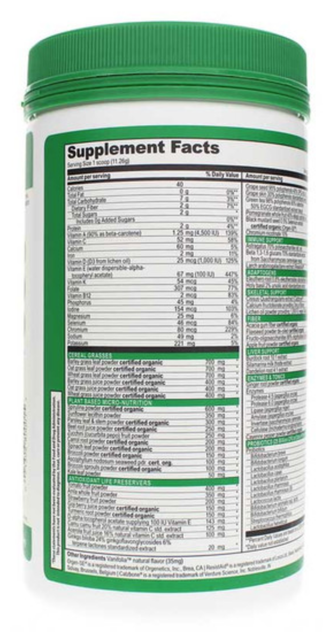 Vibrant Health, Green Vibrance, Vegan Superfood ... - Walmart Nutrition facts ; Total Fat 0.5g, 1% ; Cholesterol 0.00mg, 0% ; Sodium 40mg, 2% ; Total Carbohydrate 7g, 2% ; Dietary Fiber2g, 9%. Athletic Greens vs Green Vibrance: Which is the Better? Green Vibrance Advantages. Athletic Greens Advantages. 5 additional superfoods. Slightly lower carbs and calories. An additional gram of fiber (2.8g vs 1.9g) An additional gram of protein (4g vs 3g) 10 additional probiotic strains (vs just 2) Better tasting overall. Better value, more servings for less. The 12 Incredible Benefits of Green Vibrance - vibranthealth.com Green Vibrance contains 3 G of fiber. A good source of fiber is anywhere between 2.5g and 4.9. Fiber is good for your digestive system and it is also great for keeping hunger in check. Because it contains 3g of fiber, it can help you feel full longer and keep those pesky cravings at bay. Green Vibrance Powder - Evergreen Nutrition Green Vibrance is an excellent source of nutrition, fiber, probiotics and enzymes for people on the go, athletes and any one who desires optimal health. And, of course, there are no starches, sugar or artificial ingredients. ... Calories from Fat : 7 : Total Fat : 0.77 g : 1.2% : Cholesterol : 0 g : 0% : Sodium : 46.7 mg : 1.95% : Potassium ...