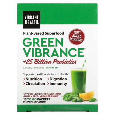 Vibrant Health, Green Vibrance, Vegan Superfood Powder, 60 Servings (FFP) Formulated to support the 4 foundations of health (nutrition, digestion, circulation, and immunity), Green Vibrance is packed with micronutrients, prebiotics and enzymes, and organic cereal grass powders and juices to feed each cell with what it needs to run at peak efficiency. An ideal supplement addition for anyone pursuing optimal health.