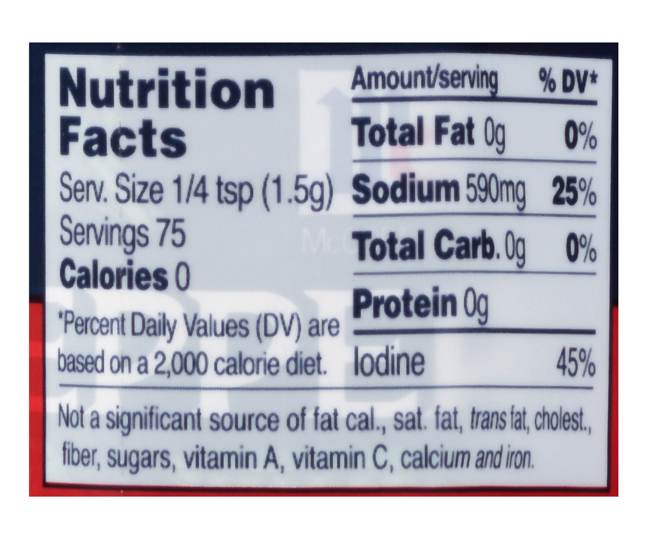 Morton® Plain Salt, 26 oz - Kroger Morton Table Salt is an all-purpose salt perfect for everything from cooking and baking to filling the shakers on your table. Simplify your time in the kitchen with Morton Table Salt. ... Nutritional Information. Kosher. Non GMO. OptUP® Nutrition Rating. Learn More. Nutrition Facts. 491.0 servings per container. Serving size 1/4 tsp (1.5g ... MORTON® TABLE SALT - Morton Salt MORTON ® TABLE SALT The Salt We're Famous For. A staple in kitchens across America. Use this all purpose salt for cooking and baking, as well as for seasoning at the table. The uniformly shaped crystals make table salt the best choice for baking, where precise measurements are critical. Available in both plain and iodized. Nutritional Facts (Plain) IODIZED TABLE SALT NUTRITIONAL FACTS - MORTON Nutrition Facts. Serving Size 1/4 tsp (1.5g) Servings per container: about 491. * Percent Daily Values are based on a 2,000 calorie diet. Calories. Total Fat. Sodium. Total Carbohydrate. Protein. Iodine.